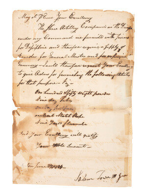 [REVOLUTIONARY WAR]. TOWN, Salem. Letter to Governor Samuel Adams requesting gunpowder for troops.