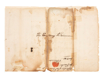 TOWN[E], Salem (1746-1825). Document signed ("Salem Town M Gen") as Major General of Militia. Addressed to Massachusetts Governor Samuel Adams, "His Excellency the Governor." Boston [MA], 27 June 1794. 1p, approx. 8 x 12 in. with integral address panel (extensive adhesive repair, dampstaining, losses). Docketed on verso "Application of Genl. Town for powder."