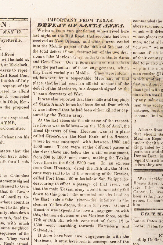 4pp., folio, 21 1/2 x 15 1/2 in. This issue contains prominent front page headlines: “Important From Texas / DEFEAT OF SANTA ANNA” with a “breaking news” first report of the decisive battle of the Texas Revolution, the Battle of San Jacinto.