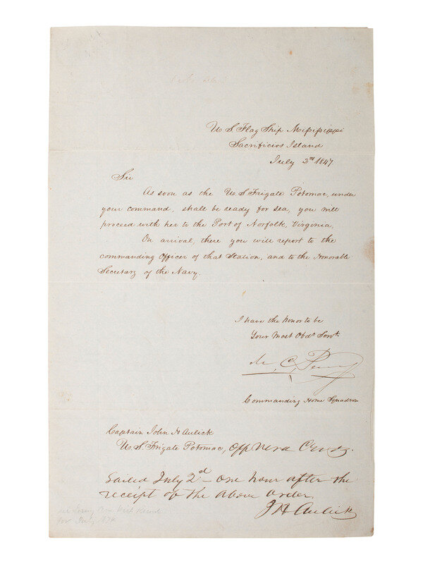 PERRY, Matthew C. (1794-1858). Letter signed ("M. C. Perry") as Home Squadron Commander, to Captain John H. Aulick. "U. S. Flag Ship Mississippi, Sacrificios Island," 2 July 1847.