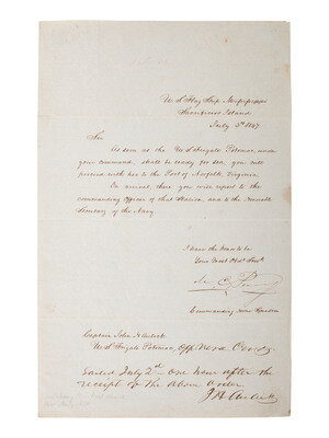 In full: "Sir, As soon as the U. S. Frigate Potomac, under your command, shall be ready for sea, you will proceed with her to the Port of Norfolk, Virginia. On arrival, there you will report to the commanding officer of that Station, and to the Honorable Secretary of the Navy."