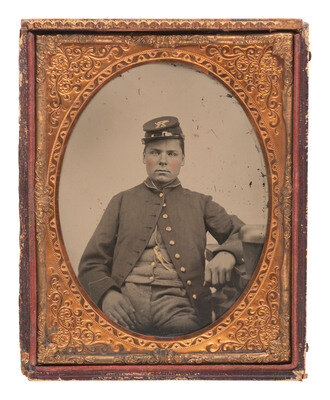 A seated, rather intimate portrait of a fresh-faced, rosy-cheeked federal soldier wearing a cap with brass bugle insignia and additional devices appearing to signify a Maine regiment: "[?][?] ME." His buttons and other details are highlighted in gold. (Few dents/creases, several abrasions and spots to plate, oxidation to mat; unsealed.) Housed under mat and preserver (no glass) in a half pressed paper case (surface wear/loss).