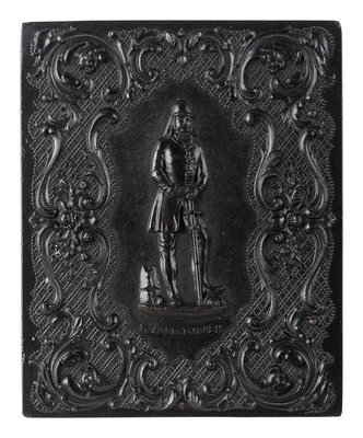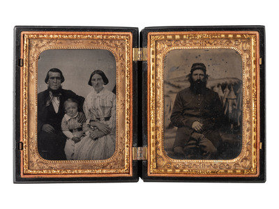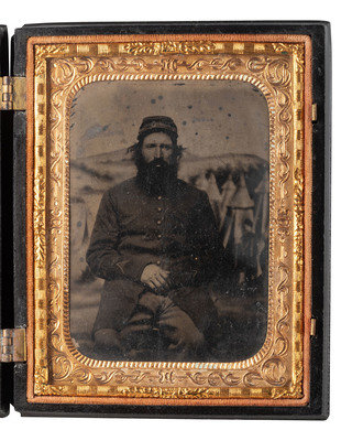 Quarter plate seated portrait of a worn soldier with long sideburns, mustache, and beard, posed before a painted backdrop featuring tents, rolling hills, and a standing soldier. (Central vertical crease to plate, scratches and abrasions throughout plate and around edge, spotting throughout; unsealed.) Housed in a Rare figural Union case, Sir Henry Havelock [1-275] (non-functioning closure) along with an additional quarter plate tintype portrait of a family.