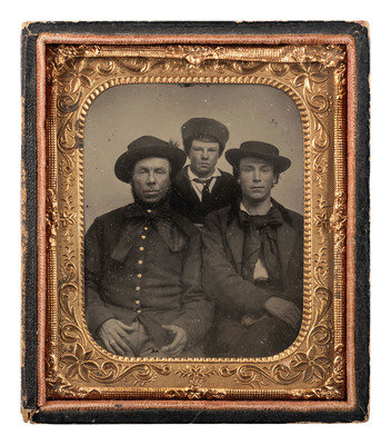 Charming group portrait featuring a middle-aged soldier with craggy complexion and chin beard, posed with a younger man and a pre-teen or teenage boy, likely his sons. (Few small abrasions with minor image loss, few other minor imperfections, else good; unsealed.) Housed in a half pressed paper case.