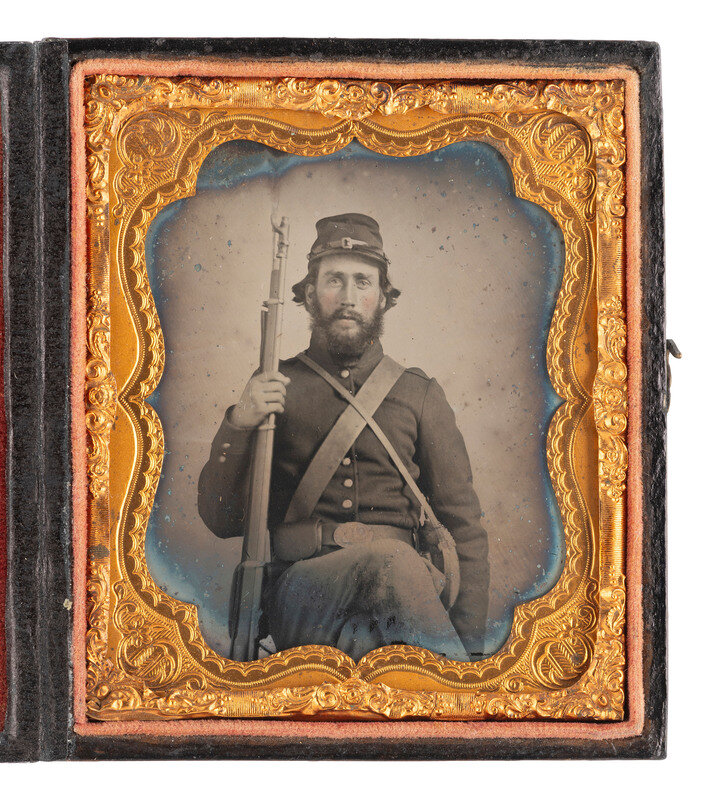 Sixth plate ruby ambrotype seated portrait of a weary-looking soldier wearing a state jacket and forage cap, with his standard accoutrements including 1858 smooth side canteen, cap pouch, and oval belt plate, visible to the camera. He holds his Enfield rifle musket by the barrel to one side. (Chemical deterioration around edges, spotting and other imperfections to plate; unsealed.) Housed in a pressed paper case.