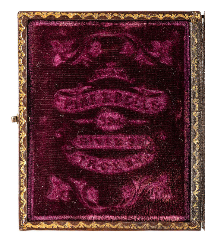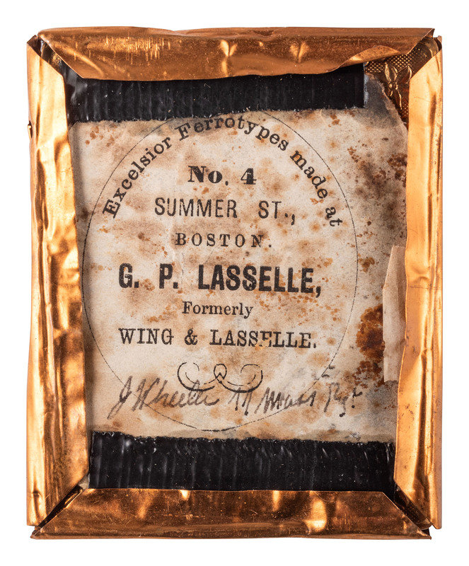Bust portrait of a young soldier wearing what appears to be a IX Corps badge or shield shaped identification pin. (Loss to upper left corner, some surface crazing/crackling; taped to cover glass with black tape on verso.) Housed in what is likely not the image's original case having a velvet pad stamped for Pine & Bells of Troy, NY (spine crudely repaired with black tape). Photographer's advertising card on image verso promotes G.P. Lasselle of Boston (formerly Wing & Lasselle) and bears ink inscription identifying the subject as "J Wheeler 11 Mass Regt."