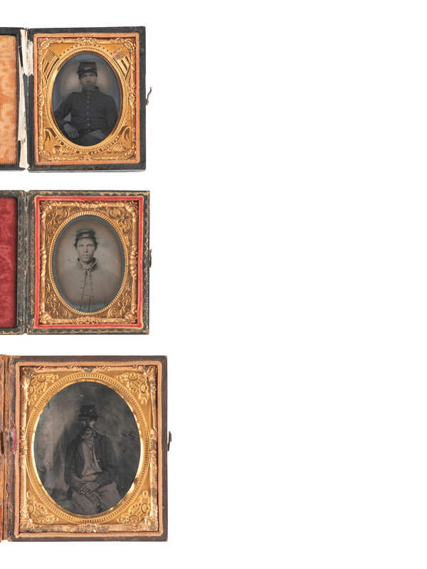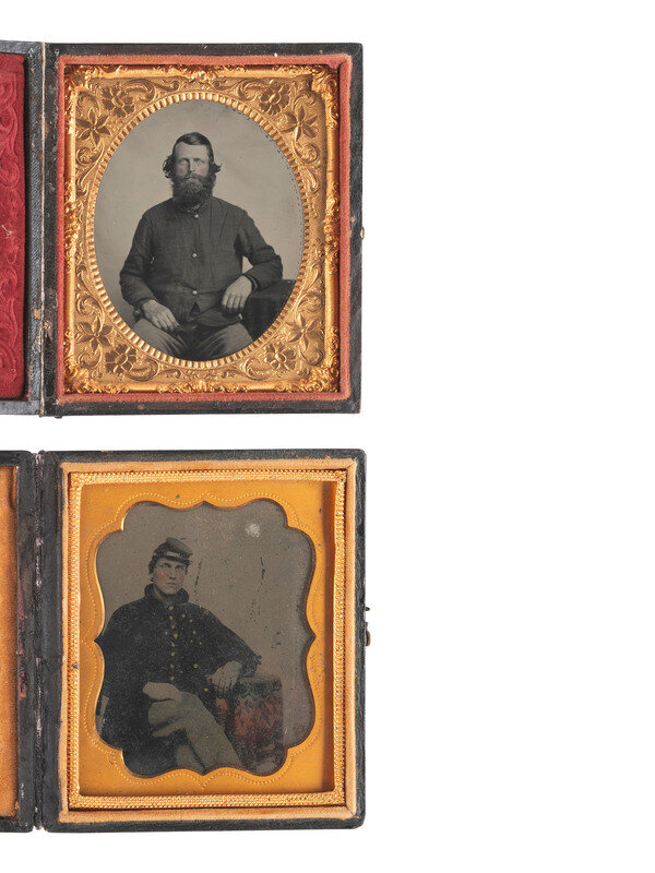 Sixth plate possibly pre-war portrait of a soldier seated at a table covered with hand tinted tablecloth. He wears a dark blue great coat and a forage cap. (Areas of surface loss and abrading, overall darkening, spotting; unsealed.) Housed in a pressed paper case. -- Sixth plate portrait of a scruffy, bearded soldier wearing a standard 4-button sack coat. (Some surface abrasions, rather clear; unsealed.) Housed in a a pressed paper case. -- Sixth plate seated portrait of a somewhat disheveled soldier with a thick mustache, wearing a forage cap and sack coat. (Image rather dark, with significant scratching and abrading, some affecting subject's face; unsealed.) Housed in a pressed paper case. Accompanied by a calling card for Annie L. Heed and newspaper clippings featuring verses about love and marriage. -- Ninth plate portrait of an infantryman wearing an overcoat. (Some haloing, image a bit dark/faded; unsealed.) Housed in a pressed paper case. -- And a ninth plate portrait of a Union soldier housed under patriotic mat and in pressed paper case with patriotic motif. -- Together, 5 cased images.