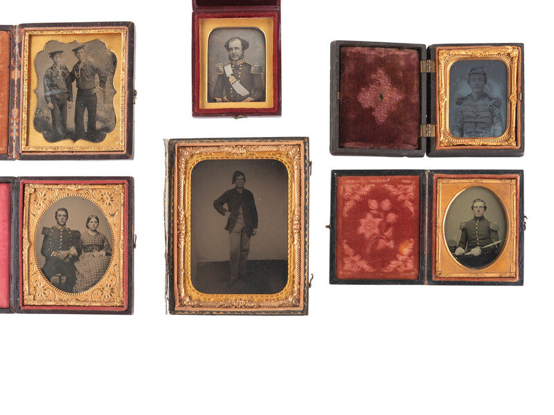 Quarter plate tintype full standing portrait of a young man in a make-shift studio wearing a tasseled smoking cap or fez, possibly that of a Zouave regiment. (Image somewhat dark; unsealed.) Housed in a fully separated pressed paper case. -- Sixth plate tintype portrait of two seamen in uniform, the man to the viewer's left wearing drop front breeches. (Some scratching and wear to plate, clipped corners; unsealed.) Housed in a pressed paper case. Plate verso reads, "Taken At Jersey City," but this has been scratched out multiple times. -- Ninth plate ambrotype seated portrait of a militiaman in full uniform including 2-piece belt buckle, epaulettes, and a knight's head militia sword. His cap resting atop the table next to him bears letters "PCG," possibly some type of city guards. (Minor losses , very clear image overall; unsealed.) Housed in a pressed paper case. -- Ninth plate daguerreotype of a middle aged likely British officer in dress uniform including gold-highlighted epaulettes, breast plate, buttons, and collar. (Some chemical splotching/deterioration, tarnishing to edges.) Housed in a flip-top maroon leatherette case. -- And 2 other images including a sixth plate ambrotype and a ninth plate ambrotype. -- Together, 6 cased images of military or navy interest.