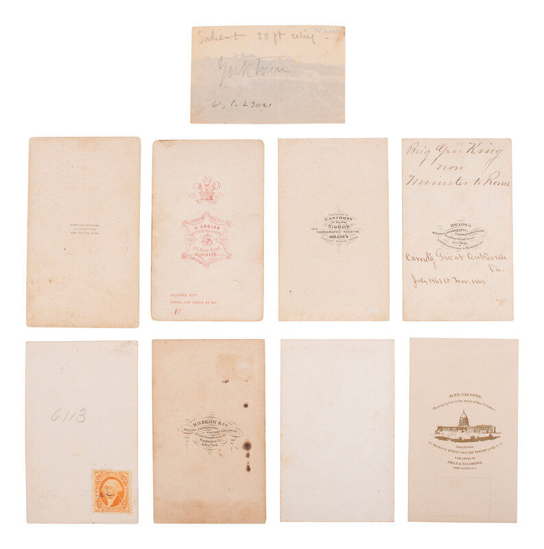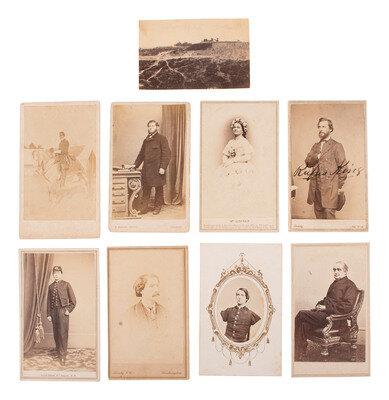 Seated portrait of Hannibal Hamlin (few spots/marks). Washington, DC: Philp & Solomons. Verso bears pictorial imprint of Alex Gardner's galleries with publishing credit to Philp & Solomons. -- Standing portrait of General Rufus King of the famed "Iron Brigade" (few spots, some soiling and light wear to edges).New York: Brady. Ink identified on image, with inscriptions on verso including "Brig Gen King now Minister to Rome" and "Comd'g Div. at Centreville Va. July 1863 to Nov. 1863." Brady's imprints on recto and verso. -- Oval image of double amputee Alfred Stratton, Company G, 147th New York (soiling, wear to edges). N.p., n.d. Stratton lost both of his arms to friendly fire at the Battle of Gettysburg in 1863. -- Vignetted portrait of Mrs. Mary Todd Lincoln (toning, light spotting). New York: E. Anthony, 1862. Caption and copyright information printed to mount recto, with Anthony publishing credit and Brady negative credit to verso. -- Unmounted albumen view of McClellan's Battery at Yorktown (unmounted, some toning/discoloration, minor creasing). Uncredited, but known to have been captured by Brady. Verso bears pencil inscriptions including "Salient 30 ft relief - Yorktown." -- Outdoor portrait of an aged officer atop a horse (significant toning, spotting, soiling, wear to edges). New Bedford, MA: Bierstadt Brothers, n.d. -- And 3 other CDVs of male subjects. -- Together 9 CDVs.