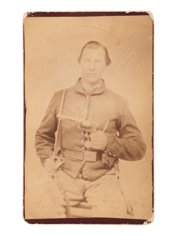 5 x 8 in. albumen photograph on cardstock mount (significant toning, some spotting/soiling, image quite blurred, wear to edges and corners). Uncredited. Portrait of a soldier wearing a Model 1851 sword belt with cap pouch, holding a revolver across his torso with one hand and a sword with the other.