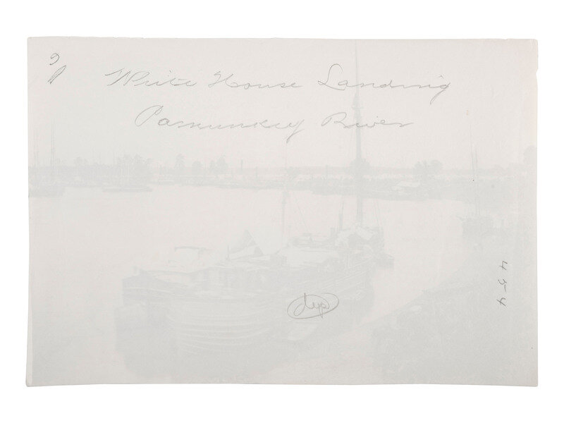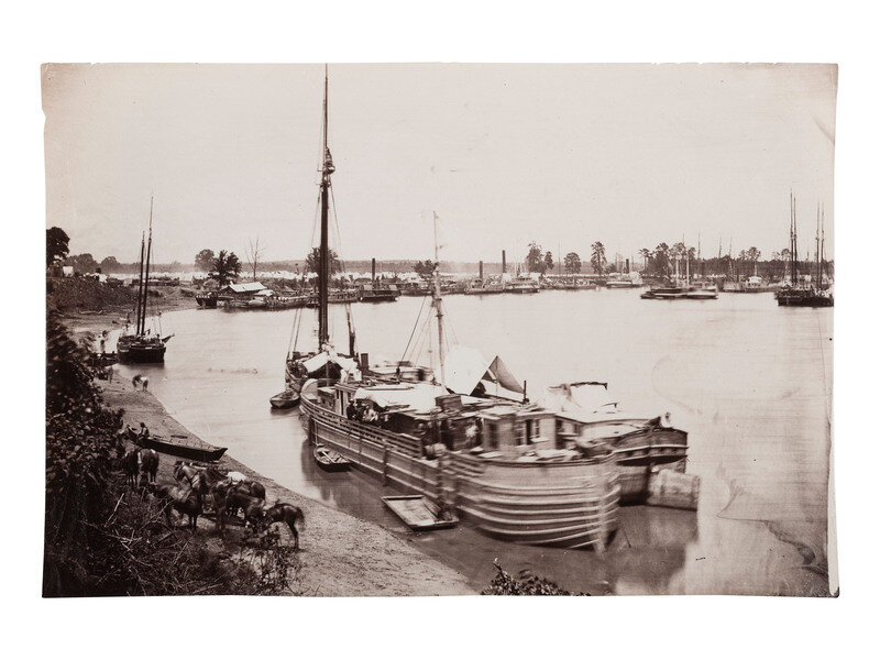 O'SULLIVAN, Timothy H. (1840-1882), photographer. Barges, Transports, and Horses, White House Landing, Pamunkey River, Virginia. 1861-1865. 5 5/16 x 7 15/16 in. albumen print (light edge wear). Verso annotated in pencil.