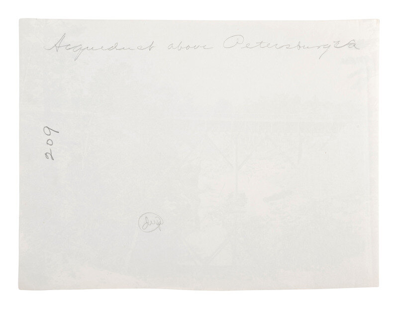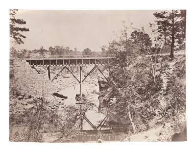 O'SULLIVAN, Timothy H., (1840-1882), photographer. Canal Aqueduct Above Petersburg, Virginia. 1864. 6 5/16 x 8 3/8 in. albumen print (light edge wear). Verso annotated in pencil.