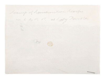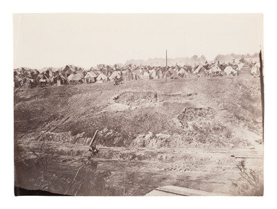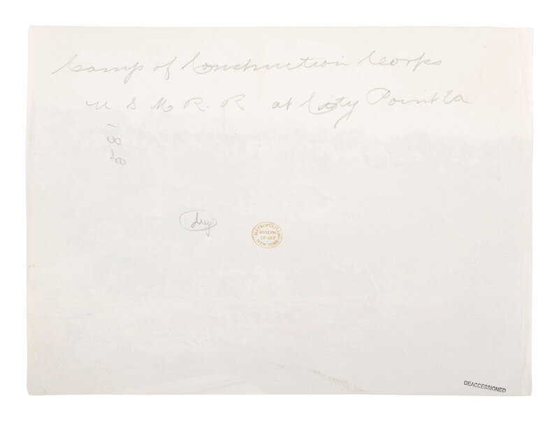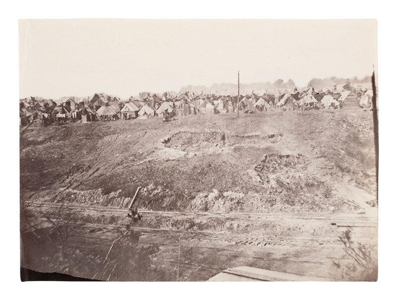 RUSSELL, Andrew Joseph (1830-1902), photographer. Camp of Construction Corps, U.S. Military Railroad at City Point, Virginia. 1861-1865. 6 1/8 x 8 7/16 in. albumen print (light edge wear, light creasing). Verso annotated in pencil, with Metropolitan Museum of Art deaccession stamp.