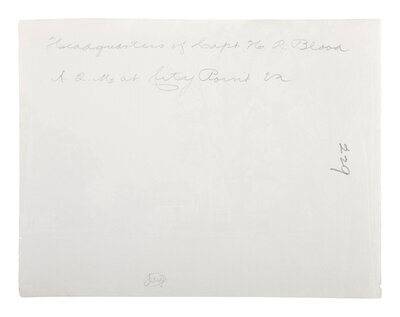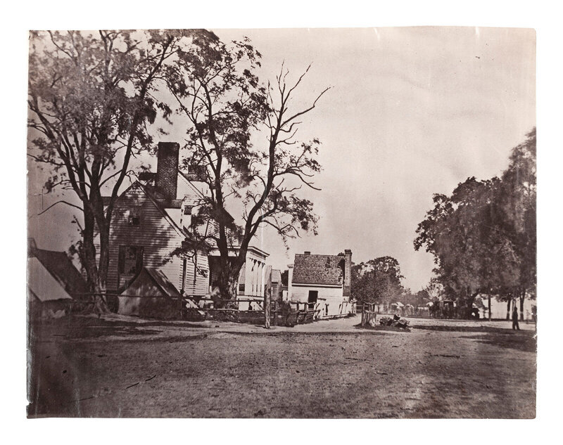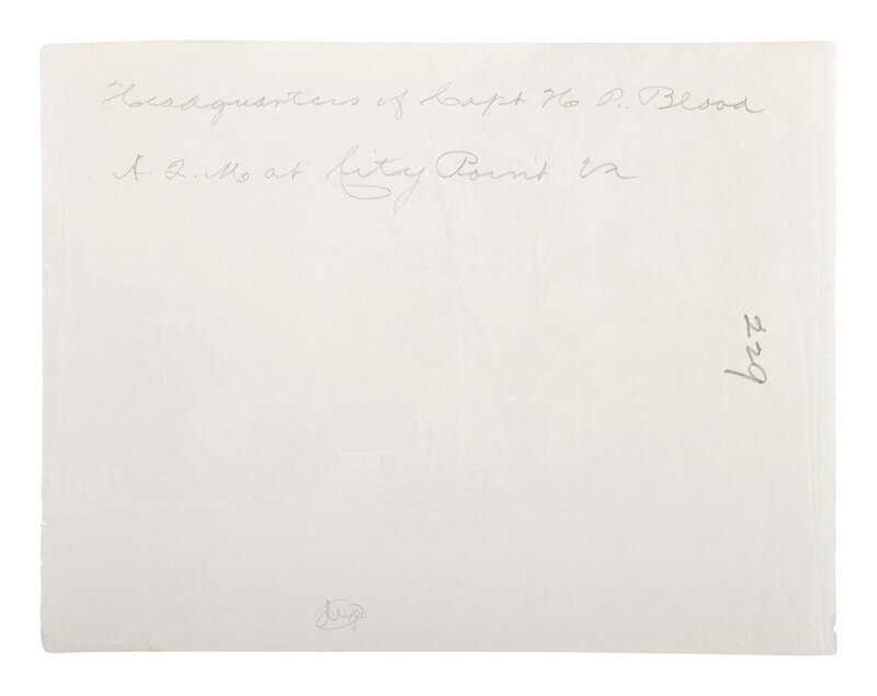 RUSSELL, Andrew Joseph (1830-1902), photographer. Headquarters of Captain H.B. Blood, Assistant Quartermaster at City Point, Virginia. Ca 1863. 6 7/16 x 8 7/16 in. albumen print (slight light creasing throughout, some edge wear). Verso annotated in pencil.