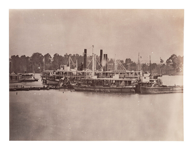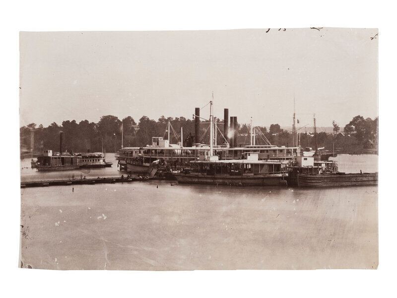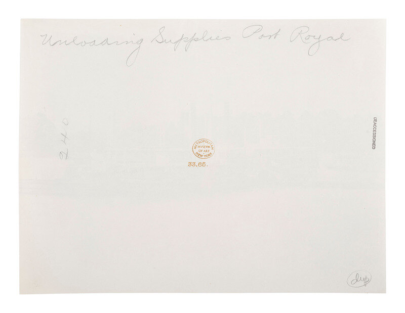 Unloading Supplies at Port Royal, Virginia. 1861-1865. 6 1/8 x 8 1/8 in. albumen print (light edge wear). Verso annotated in pencil, with Metropolitan Museum of Art deaccession stamp.