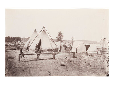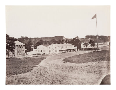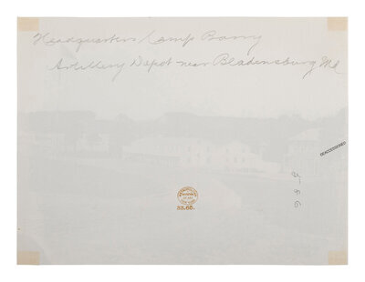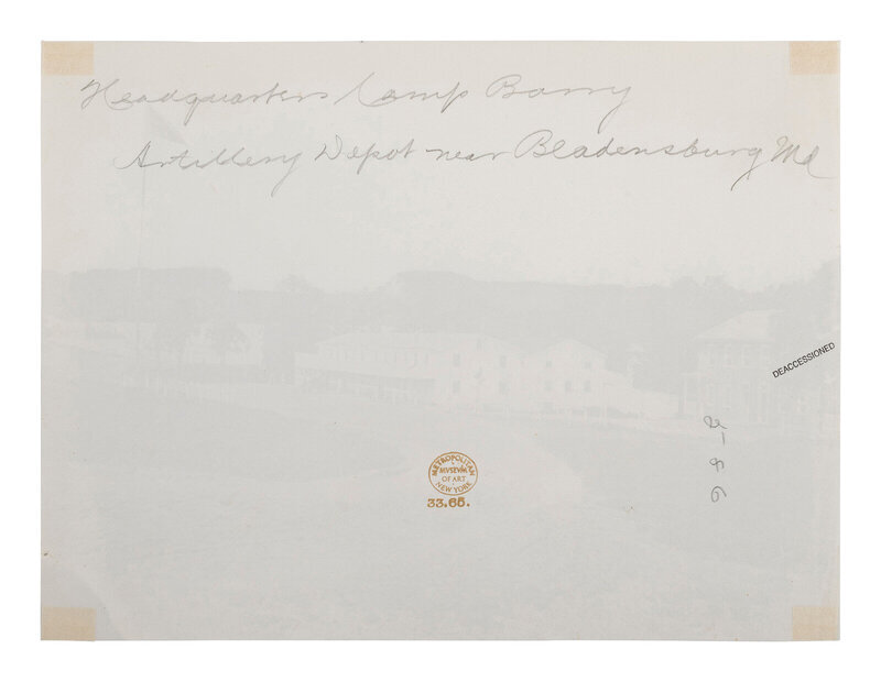 Headquarters, Artillery Depot, Camp Barry, near Bladensburg, Maryland. 1863-1865. 6 1/4 x 8 1/4 in. albumen print (light edge wear, mounting residue on verso). Verso annotated in pencil, with Metropolitan Museum of Art deaccession stamp.