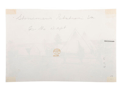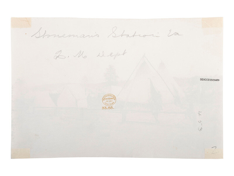 Photographer unknown. Stoneman's Station, Virginia, Quartermaster Department. 1861-1865. 5 1/8 x 7 13/16 in. albumen print (light edge wear, mounting adhesive on verso). Verso annotated in pencil, with Metropolitan Museum of Art deaccession stamp.
