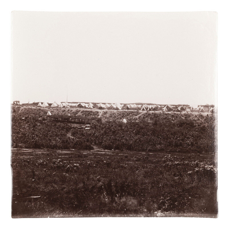Photographer unknown. View of an unidentified Union Army encampment on a bluff. 1861-1865. 4 1/8 x 4 1/8 in. albumen print (light edge wear). Verso annotated in pencil.
