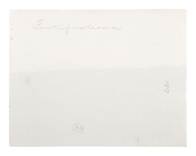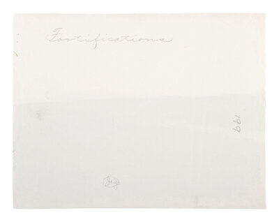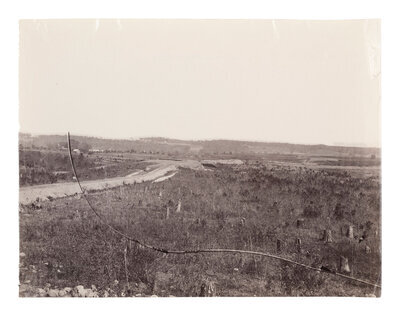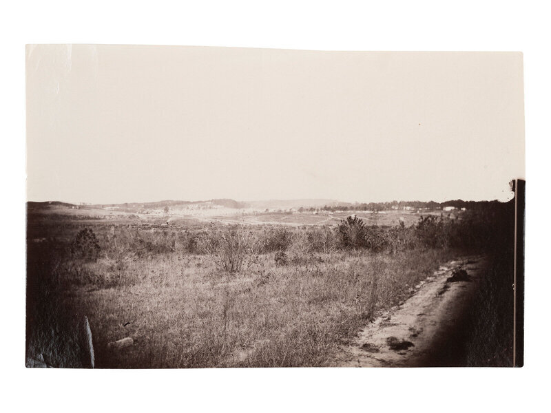 Photographer unknown. Landscape featuring distant view of earthwork fortifications. 1861-1865. 6 7/16 x 8 7/16 in. albumen print (some edge wear including few pinholes and short tears to right edge). Verso annotated in pencil.
