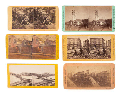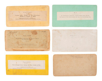 [CIVIL WAR]. 6 stereoviews, incl. images of Harpers Ferry, ruins of Charleston, and camp life.