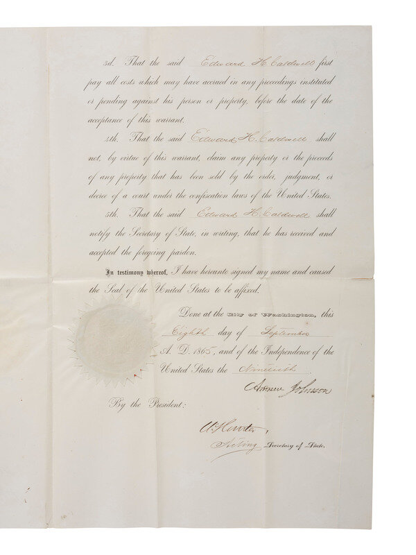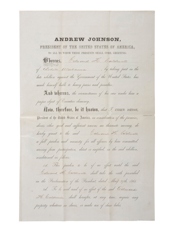 JOHNSON, Andrew (1808-1875). Partly-printed Presidential pardon stamp-signed ("Andrew Johnson") for Edward H. Caldwell. Washington DC, 8 September 1865. 2 pages, 11 1/2 x 18 in., creasing, with some separations to creases (some taped repair), light wrinkling and occasional spotting. Countersigned by Acting Secretary of State William Hunter, Jr. (1805-1886). Embossed seal affixed to lower portion of second page.