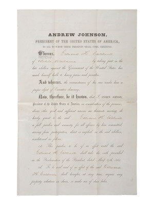 [CIVIL WAR] JOHNSON, Andrew (1808-1875). Partly-printed Presidential pardon stamp-signed by Johnson.