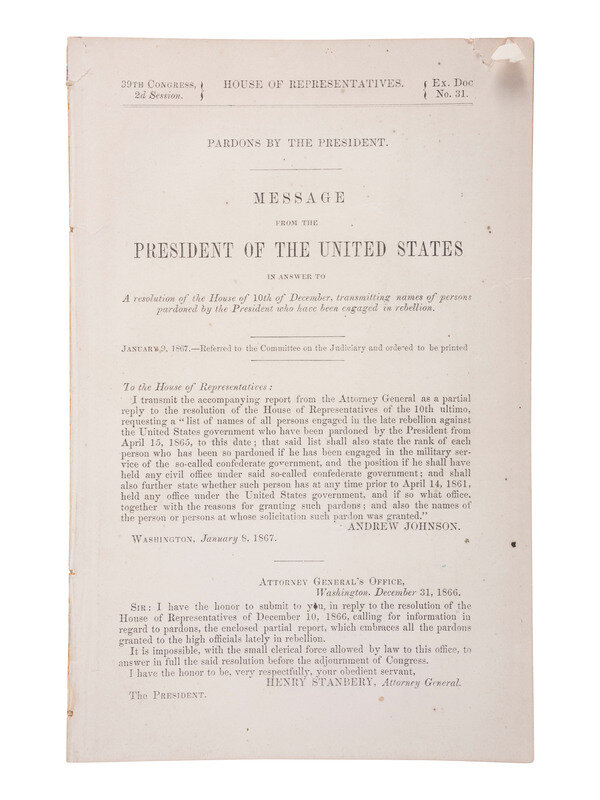 [With:] Pardons by the President. Message from the President of the United States in Answer to A resolution of the House of 10th of December, transmitting names of persons pardoned by the President who have been engaged in rebellion. [Washington, DC], [1867]. House issue. Ex. Doc 31. 8vo, 26pp, with some rips/tears and spotting.