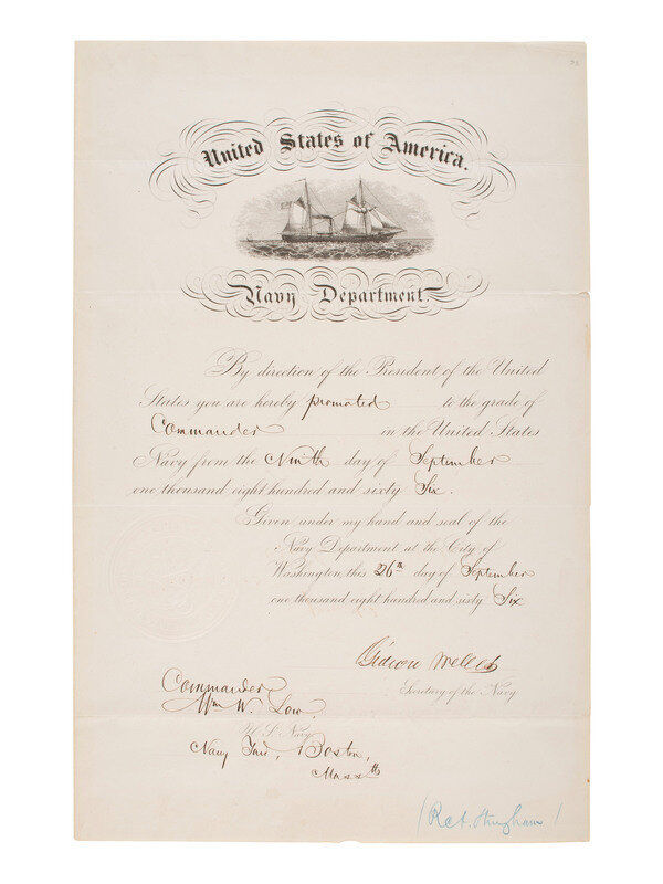 US Navy Department appointment signed ("Gideon Welles"), as Secretary of the Navy. Washington, DC, 26 September 1866. 1p., folio, 15 x 9 1/2 in., top edge partially affixed to board for display under mat. With vignette of a steamer at top and embossed seal.