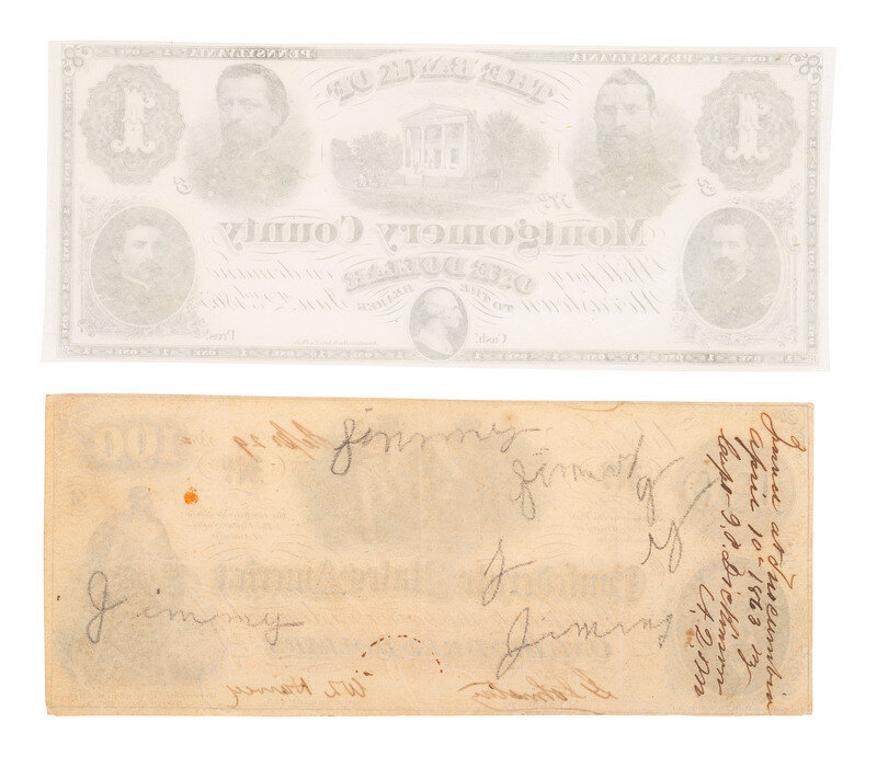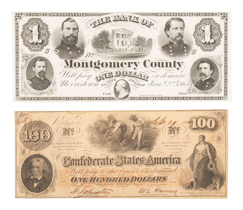 Bank of Montgomery County. Norristown, PA: 2 January 1865. $1 note, 3 x 7 1/2 in. Clockwise, the three Union generals and one colonel depicted on this $1 remainder are Gen. Winfield S. Hancock, Gen. John Hartranft, Col. Edwin Schall, and Gen. Adam J. Slemmer. The bank building is seen at center. The bank operated from 1814-1865 and then became the Montgomery National Bank, charter number 1148. (Very fine condition.)