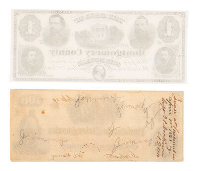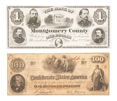 [CIVIL WAR]. Union and Confederate currency, incl. $100 note found on battlefield by ID'd officer.