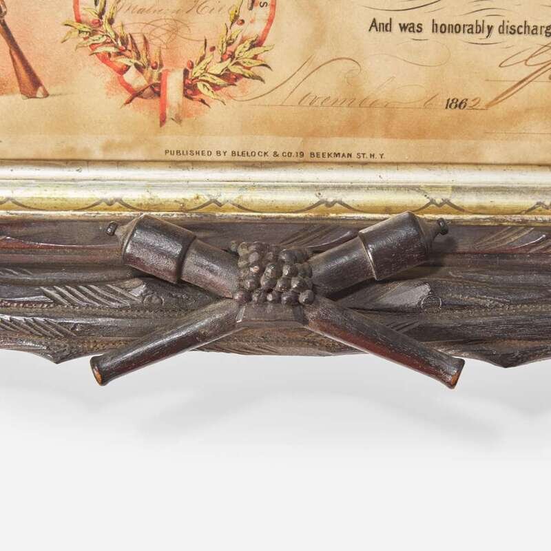 Carved rusticated frame decorated with crossed cannons, cannon balls and American shields, enclosing the honorable discharge of Charles A. Clark from Company E, 5th Battery Massachusetts Light Artillery, signed by his commander, Captain George D. Allen. 26 in. x 30 in. (overall).