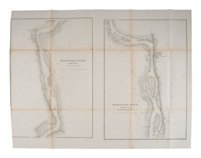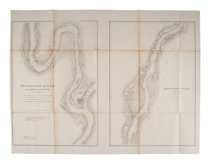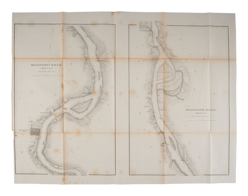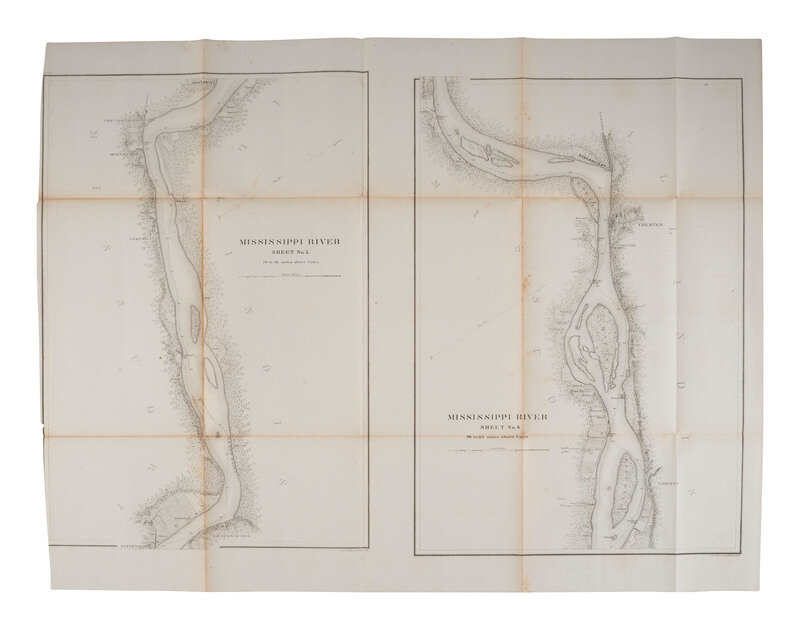 Complete set of six charts detailing the course of the Mississippi River from Cairo, Illinois, to St. Mary's, Missouri. Created for use by Rear Admiral S.P. Lee's Mississippi Squadron. Titles include: "Sheet No.1 / 1 to 25 miles above Cairo Ill."; "Mississippi River / Sheet No. 2 / 25 to 41 miles above Cairo"; "Mississippi River / Sheet No. 3 / 41 to 61 miles above Cairo"; "Mississippi River / Sheet No. 4 / 62 to 78 miles above Cairo"; "Mississippi River / Sheet No. 5 / 78 to 96 miles above Cairo"; "Mississippi River / Sheet No. 6 / 96 to 115 miles above Cairo." Sizes vary slightly, approx. 34 x 26 in. Rarely seen as a complete set. Condition generally good with expected toning, creasing at folds.