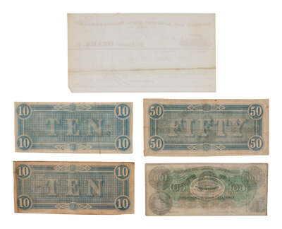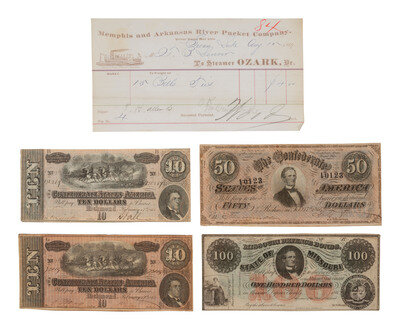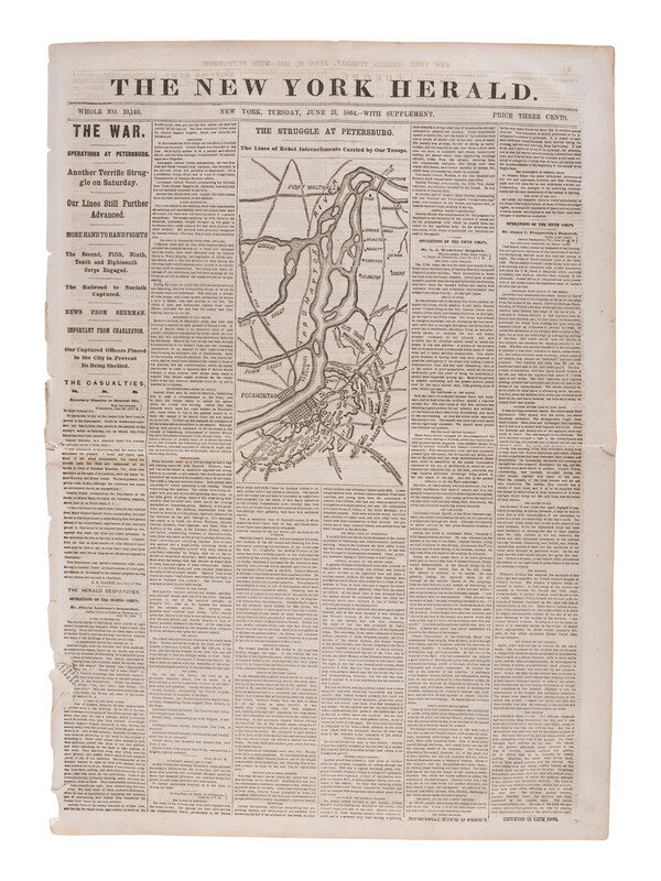 [With:] A group of 3 Confederate bills: 17 February 1864, $10 Confederate States of America bill featuring "Horses pulling cannon" at center and Robert M.T. Hunter (2); 17 February 1864, $50 Confederate States of America bill featuring Jefferson Davis at center. -- Requisition for Missouri Defense Bond, $100 note, unissued. -- The New York Herald. No.10,140. New York, 21 June 1864. Featuring front page article and illustration of "The Struggle at Petersburg."