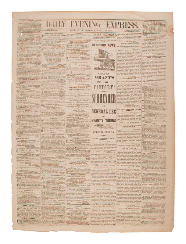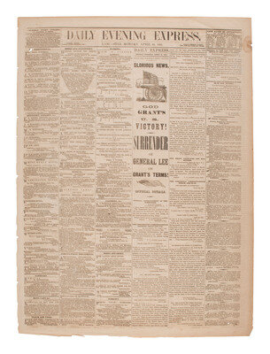 Daily Evening Express. Vol. XVII, No. 129. Lancaster, PA: Pearsol & Geist, 10 April 1865. 2pp., 21 1/2 x 16 in. Front page featuring illustrated breaking news announcing "God Grants U.S. Victory! Surrender of General Lee on Grant's Terms!"