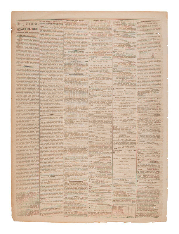 This appears to be a second edition "extra" distributed late in the afternoon of 10 April 1865 as coverage of Lee's surrender came in. The Daily Evening Express had published an earlier 10 April issue (4pp. in length), which did not include news of Lee's surrender; however, later in the afternoon a new front page was issued that contained the "breaking news" headlines of Lee's surrender. That late issue was attached to the earlier 4pp. issue.