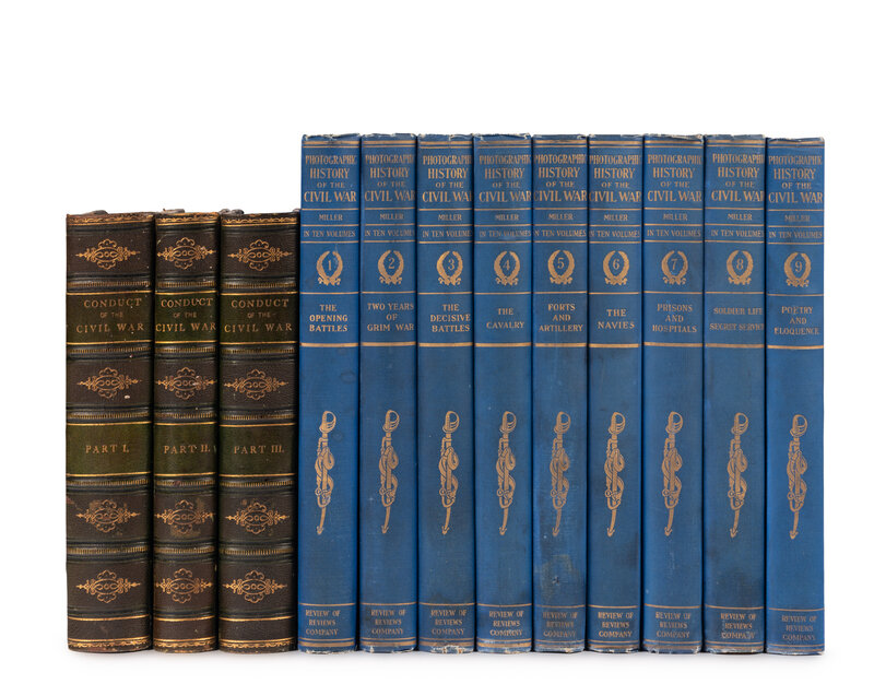 MILLER, Francis Trevelyan, editor. The Photographic History of the Civil War. New York: The Review of Reviews, 1911. 9 (of 10) volumes, 4to. Numerous illustrations from photographs. Original blue cloth (some darkening and rubbing to spines, some covers cleaned). FIRST EDITION.