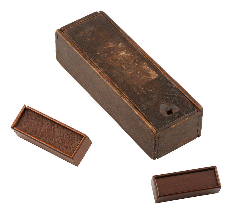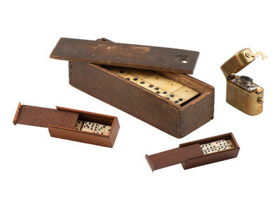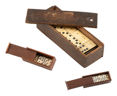 One standard size 7 x 2 3/8 in. original wooden slide top box containing 28 bone on ebony dominoes with brass tacks, each approx. 1 3/4 x 7/8 in. (chipping to a few pieces, browning to many). -- A pocket size, 1 x 3 in. wooden slide top box containing 27 pieces, each approx. 1/4 x 5/8 in. (occasional chipping, discoloration). -- A pocket size, 2 1/2 x 7/8 in. wooden slide top box bearing a French label for "Maison Delacroix" containing 27 pieces, each approx. 9/16 x 5/16 in. (sparse chipping, discoloration).