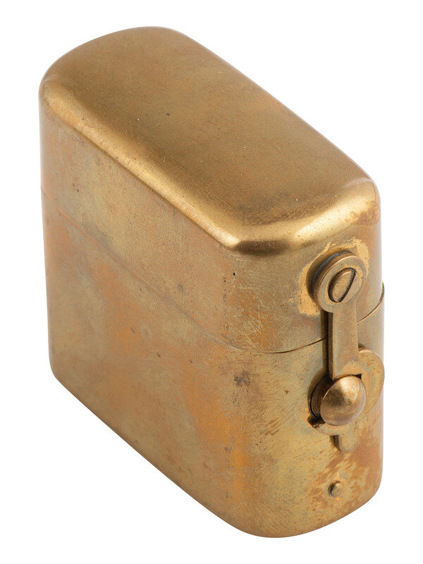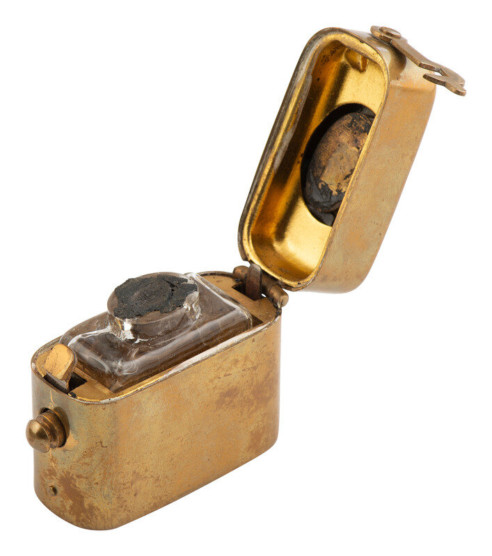 [With:] Officer's traveling ink well comprising a glass bottle housed inside of a metal spring-loaded push-button case with locking mechanism. Overall 1 7/8 x 1 5/8 x 7/8 in.
