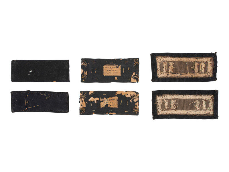 1) Pair of Smith's Patent Infantry Captain's shoulder straps in a Riker display box, nominally 3.85 x 1.6 in. Faux gold bullion brass borders and bars, dark blue wool broadcloth background. With Smith's Patent paper labels on reverse.