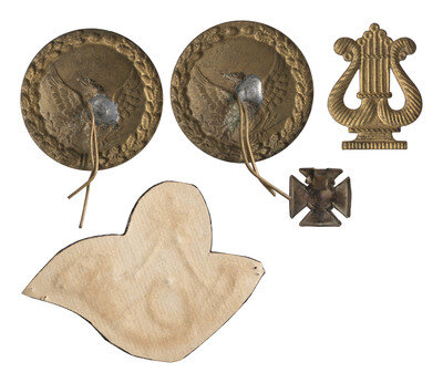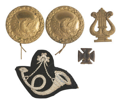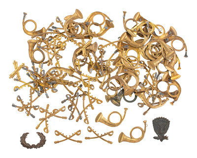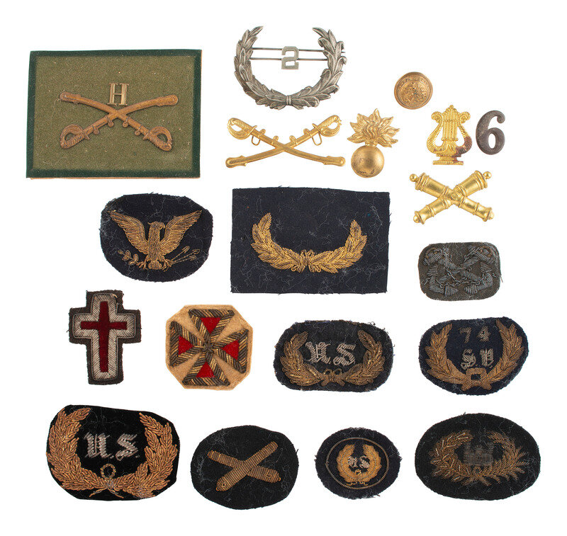 Mixed group of approx. 75 brass cavalry and infantry insignia, mostly Bannerman restrikes. -- Forage cap cavalry insignia and "H" company letter mounted on green felt. -- Civil War-era musician's embroidered, gold wire horn kepi insignia. -- Riker mount containing XIX Corps pin inscribed "NY117," accompanied by modern tag furnished by consignor identifying the pin as a 117th New York Corps pin with fragment of regimental flag (no further provenance accompanies the artifacts confirming this identification). -- Mixed group of 11 cloth insignia, majority likely produced post-Civil War. -- And more.