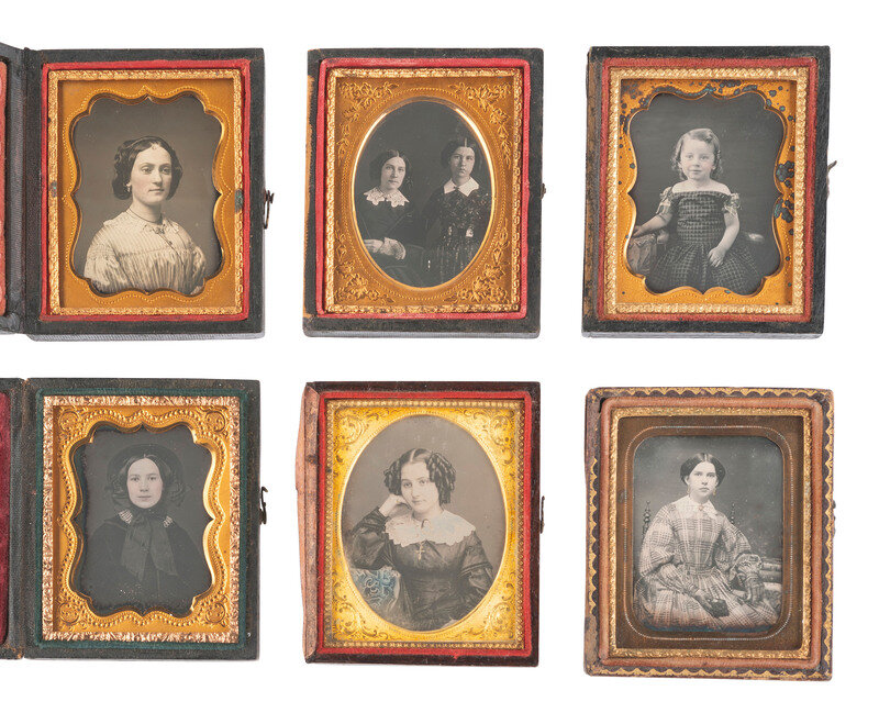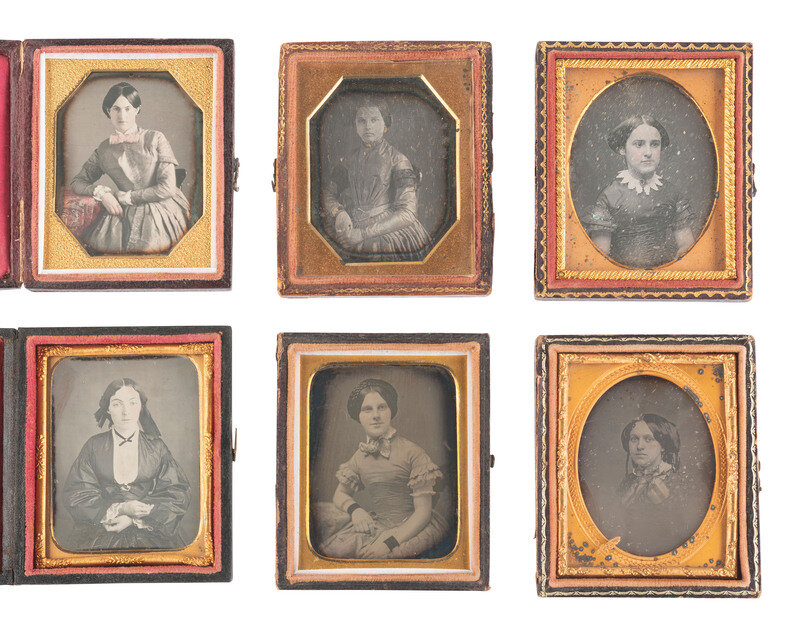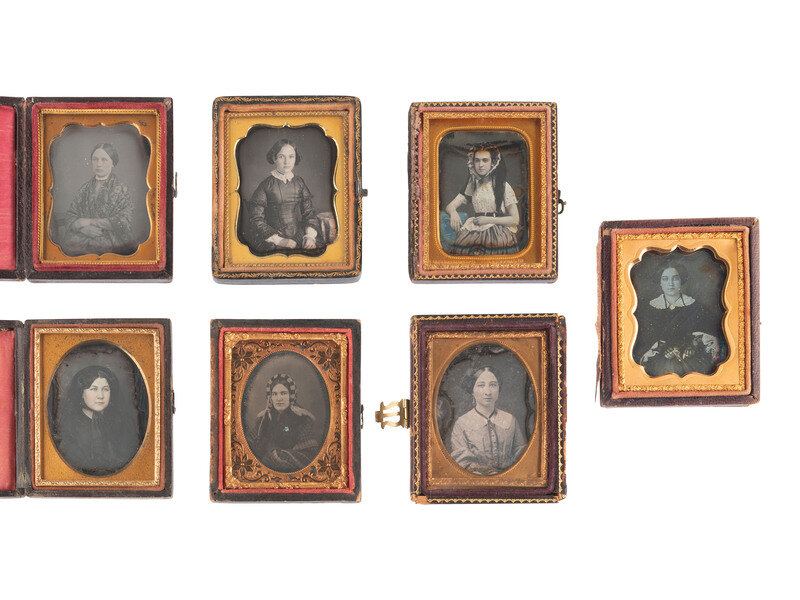 [EARLY PHOTOGRAPHY]. 17 ninth plate daguerreotypes of female subjects and 3 ninth plate ambrotypes.