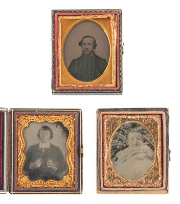 Portrait of two young women, one sporting a fur cuff and lace collar. (Some tarnishing to right portion affecting subject's face.) Housed in a half pressed paper case. -- Seated portrait of a young lady with tightly curled hair worn up on either side of her head, leaning on her elbow, supported by a table covered in hand-tinted blue cloth. She wears an ornate crucifix pendant and a large cameo brooch. (Spotting, wipe marks; resealed.) Housed in a fully separated pressed paper case. -- Strikingly clear bust portrait of a young woman wearing a dress with a silky sheen. (Bit of tarnishing to edges, minimal spotting.) Housed in a pressed paper case. -- And 16 other ninth plate daguerreotypes featuring female subjects. Image conditions mostly fair to good.
