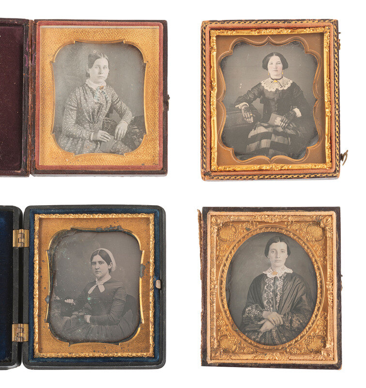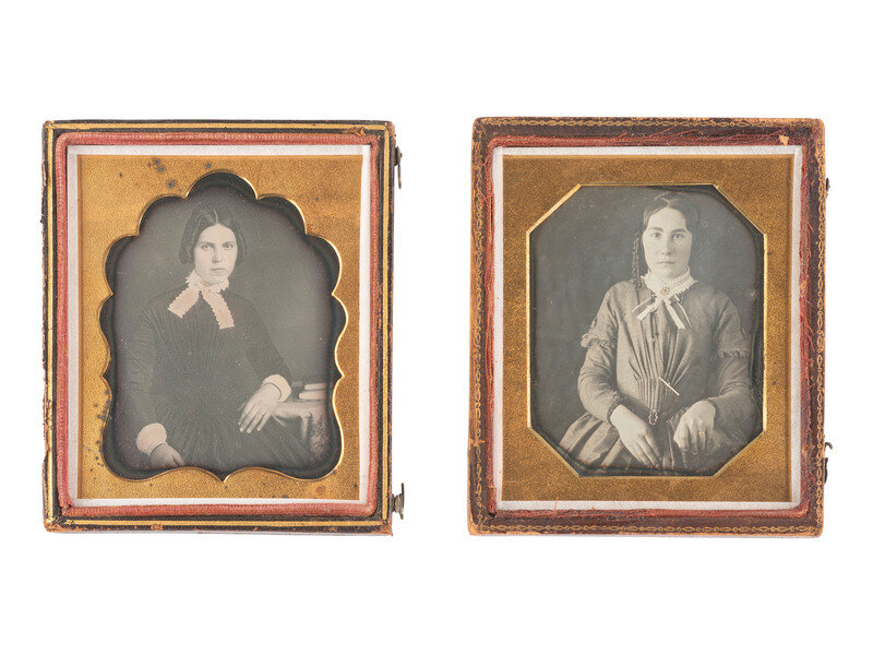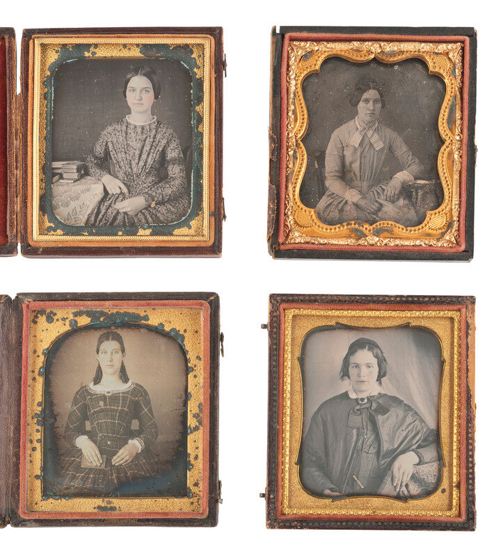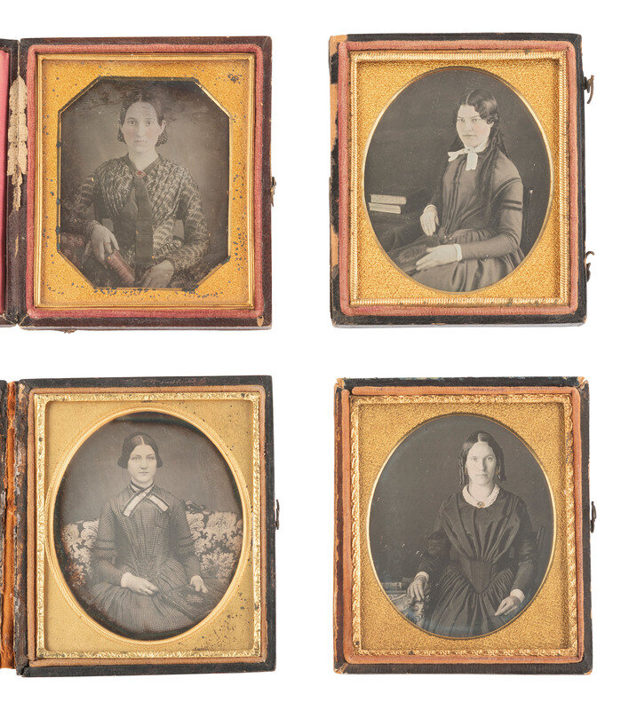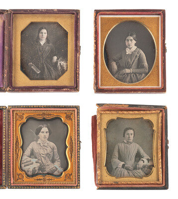 Seated portrait of a woman wearing a floral printed dress, holding a small book in her hand and having what appears to be a larger volume placed on the table next to her. (Some tarnishing to edges, some spotting, no preserver; resealed.) Housed in a leatherette case (surface wear throughout) with velvet pad bearing a floral design above "BOGARDUS, N.Y." -- Seated portrait of a young woman with rose-tinted cheeks seated next to a table with several books stacked and strewn over it. (Plate with some oxidation residue and light tarnishing to edges, few spots and imperfections, heavy oxidation to mat; original seals.) Housed in a leatherette case made by William Shew (surface wear/loss, discoloration), with a scrap of paper behind image inscribed "Frances Manning." -- Seated portrait of a young lady wearing an intricate lace collar and gloves, resting her arm on the table next to her which also supports a stack of three books, one of which appears to be Barrett's Grammar. (Tarnishing to edges, few stray scratches, one crescent-shaped imperfection appearing to be in the image to left of sitter's head, else a very crisp and clear image; reglazed and resealed 2021.) Housed in a pressed paper case (surface wear). -- And 15 others. Conditions and housings vary. -- Together, 18 sixth plate daguerreotype portraits featuring women with books.