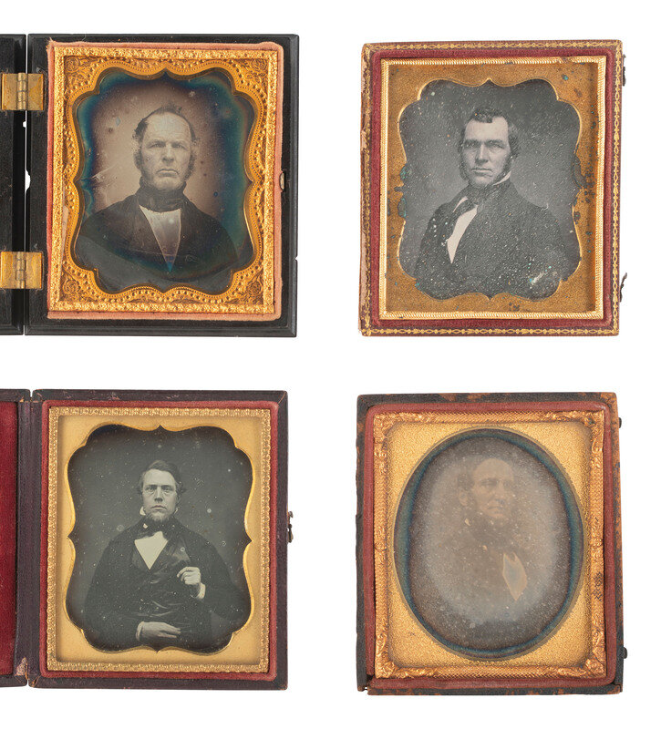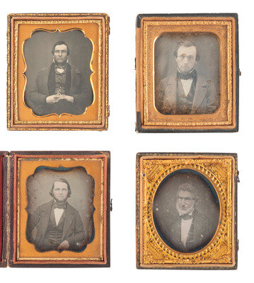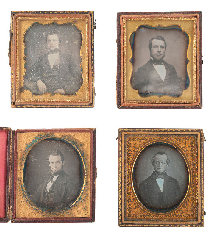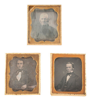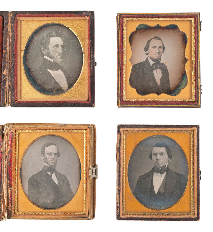 Seated portrait of a heavily freckled man with a short beard and striking gaze. He wears a watch chain attached to his vest. (A bit of tarnishing to edges, other minor imperfections; reglazed and resealed.) Housed in a fully separated pressed paper case (split at spine, surface wear). -- Bust portrait of an older gentleman with graying hair, including a beard and sideburns extending one ear to the other. (Tarnishing to edges, some clouding and spotting throughout image.) Housed in a half pressed paper case (surface wear). -- And 17 others. Conditions and housings vary. -- Together, 19 sixth plate daguerreotypes of men with assorted facial hair styles including beards and sideburns.