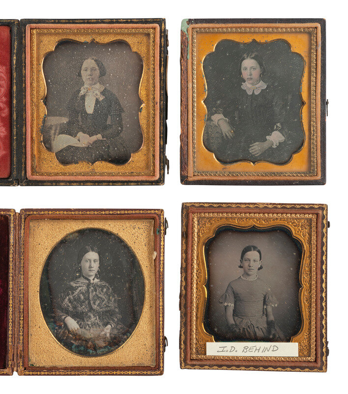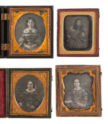 Seated portrait of a young woman with her hair worn down in curls, posed with her elbow resting on a large volume laying flat on the table next to her. The case and pose suggest that this is a European image. (Heavy tarnishing to edges, some spotting and other imperfections; no preserver present.) Housed in a fully separated maroon leatherette case (split at spine, surface wear throughout). -- Seated portrait of a young woman with her hair worn up but with strands hanging around her face in curls, wearing a floral patterned dress, gold-highlighted jewelry, and lace gloves. (Tarnishing to edges, some clouding and dust particles; original seals.) Housed in a fully separated pressed paper case with velvet pad stamped "BOGARDUS, ARTIST. NEW YORK." (split at spine, surface wear/loss throughout). -- Lovely portrait of a finely dressed young lady wearing several pieces of gold-highlighted jewelry including earrings, rings, and a wrist cuff, and staring directly into the camera lens. (Some clouding, spotting, and weeping/specks between glass and image, with heavy oxidation to mat; resealed 1994.) Housed in a Union case with scroll/geometric design (soiling, some nicking). -- Seated portrait of a girl wearing a plaid dress and gold-highlighted brooch. (Some spotting and clouding, spotting to mat; resealed.) Housed in a pressed paper case (surface wear) with velvet pad stamped for "REIMER'S GALLERY, 397 NO. 3RD AB. GREEN, PHILADELPHIA" and pencil inscription behind image reading, "Lib Boardman, Julia & [indecipherable] at 18." -- 15 others. Conditions and housings vary. -- Together, 20 sixth plate daguerreotypes of young women.