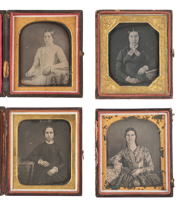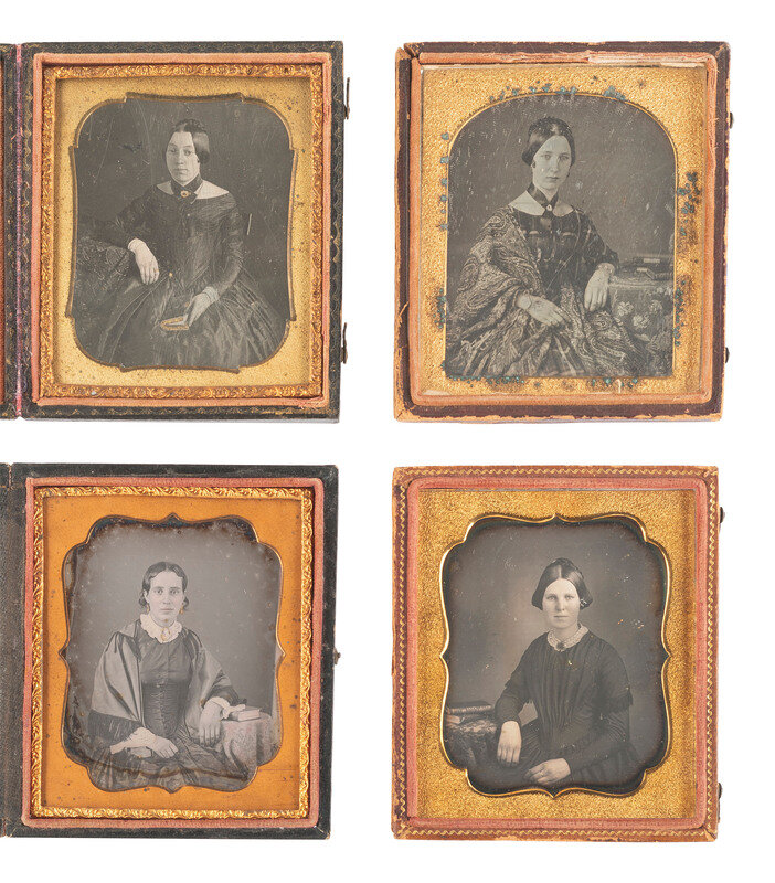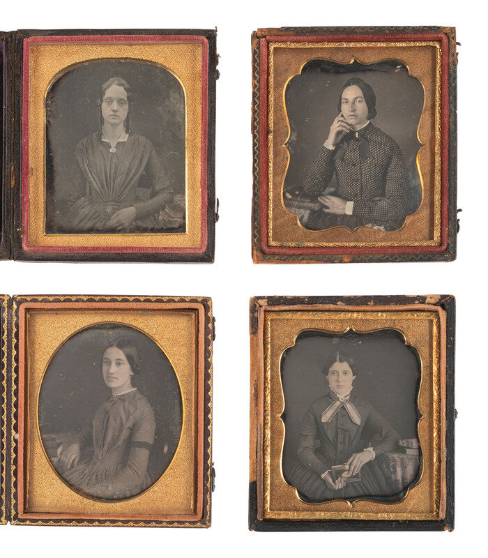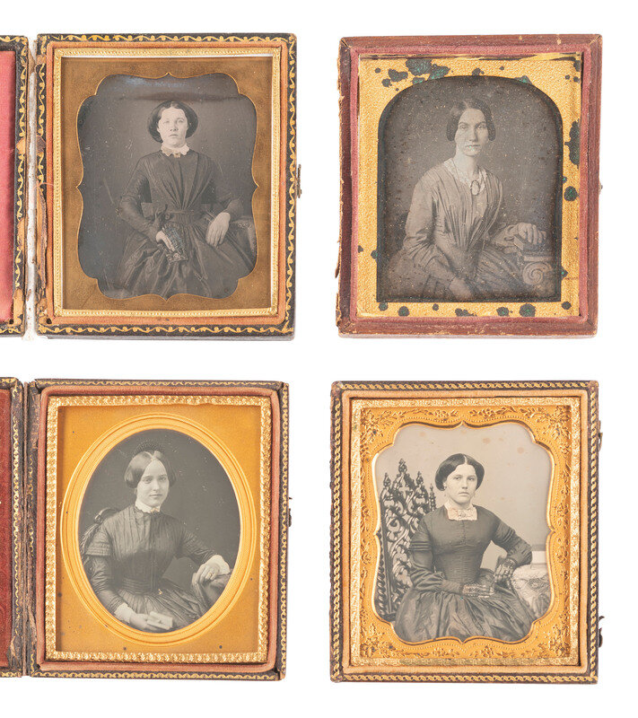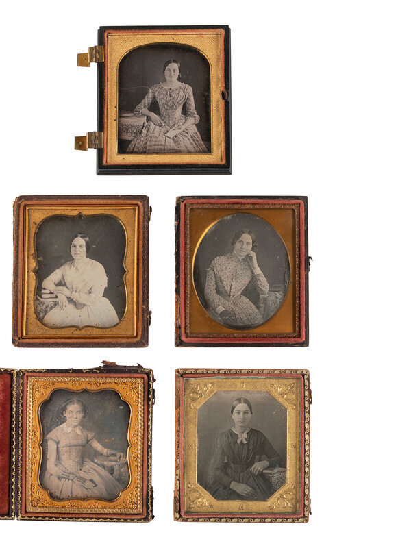 Crisp portrait of a young woman seated in an ornately carved wooden chair, wearing lace gloves and posing with a thick volume on the table next to her. (Some spotting to plate and mat; reglazed and resealed.) Housed in a fully separated pressed paper case (split at spine, surface wear) with penciled inscription behind image reading, "16 years old when this was taken Ellen M. Larrabee." -- Crisp image of a young woman wearing some kind of woven headpiece in her hair and a gold-highlighted brooch on her collar, holding open a small book in her lap with her thumb. (Minor surface imperfections, spotting to mat; reglazed and resealed 2018.) Housed in a leatherette case (repair to spine, surface wear throughout). -- And 19 others. Conditions and housings vary. -- Together, 21 sixth plate daguerreotypes featuring women with books.