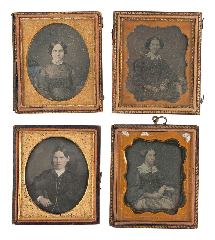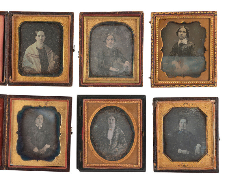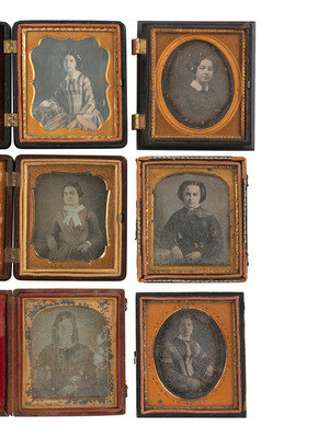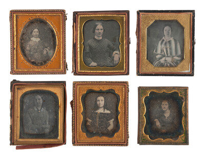 Seated portrait of a woman looking off-camera, adorned with gold-highlighted jewelry including two rings, a bracelet, and several strands around her neck by ANSON. (Tarnishing to edges, some dust specks and plate imperfections including scratches; resealed with transparent tape, no preserver present.) Housed in a half pressed paper case with hanging fob attached at top (surface wear, some losses and separations). Brass mat stamped "ANSON." -- Seated portrait of a lovely woman looking directly into the camera with a slight smile or smirk, wearing a dress with fringed detail and gold hoop earrings. She sits on a piece of upholstered furniture that has been lightly hand-tinted blue. (Very minor tarnishing visible to upper edge, some dust specks between glass and plate; original seals.) Housed in a half pressed paper case (surface wear, cracking). -- Seated portrait of a lovely young woman wearing a patterned dress with scalloped collar and intricate fingerless lace gloves. (Spotting, clouding, minor tarnishing.) Housed in a half pressed paper case (surface wear). -- And 19 others. Conditions and housings vary. -- Together, 22 sixth plate daguerreotypes featuring women wearing gold-highlighted jewelry and otherwise interesting accessories.
