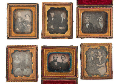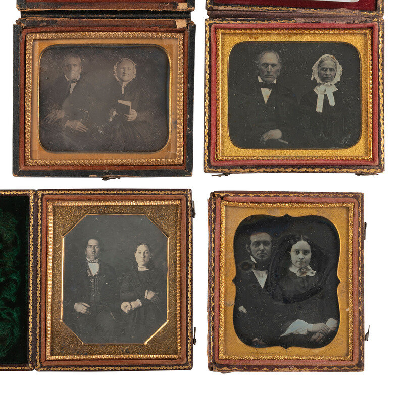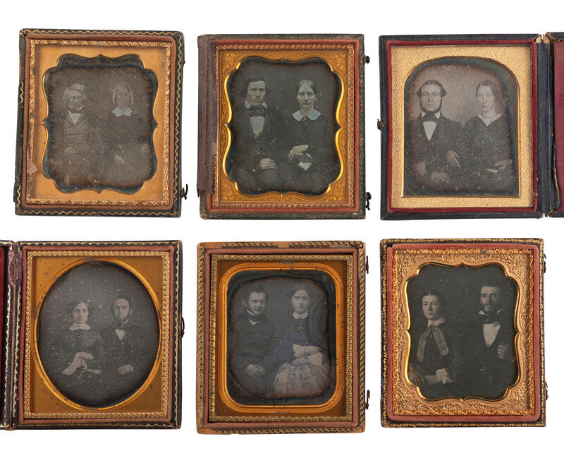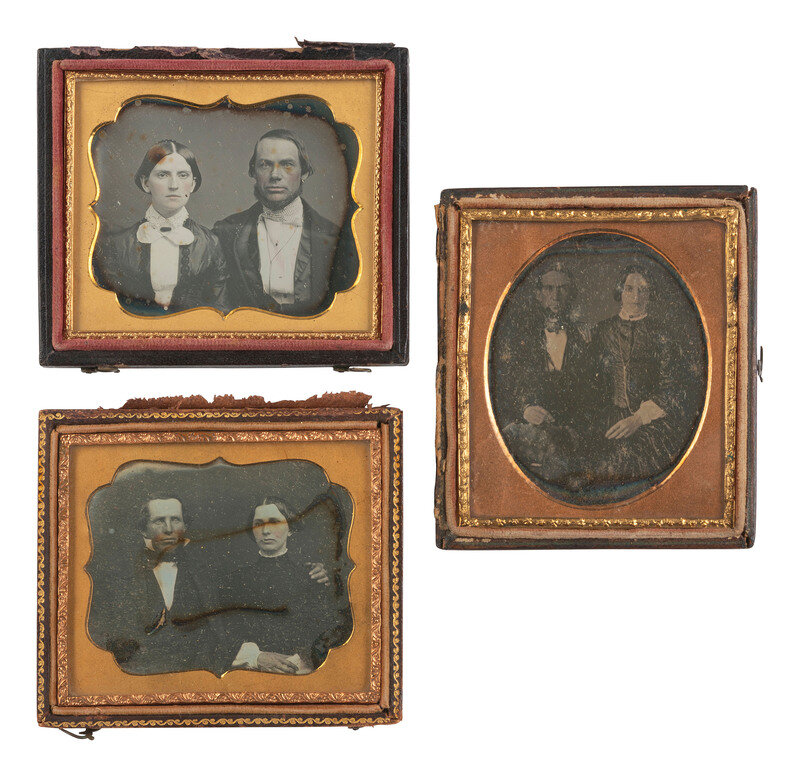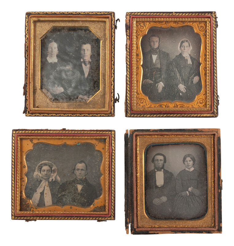Landscape-oriented portrait of an elderly couple, the woman wearing a bonnet and holding a book and a pair of eyeglasses in her hands. (Significant tarnishing, clouding, spotting, few scratches; resealed with transparent tape.) Housed in a pressed paper case (modern crude repair to split spine, modern hardware added, significant wear throughout). -- Portrait of a young to middle-aged man and woman, posed holding hands. (Some clouding, spotting, oxidation to mat; resealed 1993.) Housed in a pressed paper case (surface wear). -- Landscape-oriented portrait of an older couple, both with furrowed brows creating intense and dark expressions on both of their faces. (Spotting, minor tarnishing; original seals.) Housed in a nearly separated pressed paper case (separation to spine, heavy surface wear throughout). -- And 20 others. Conditions and housings vary. -- Together, 24 sixth plate daguerreotype portraits of couples.