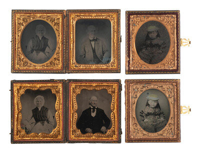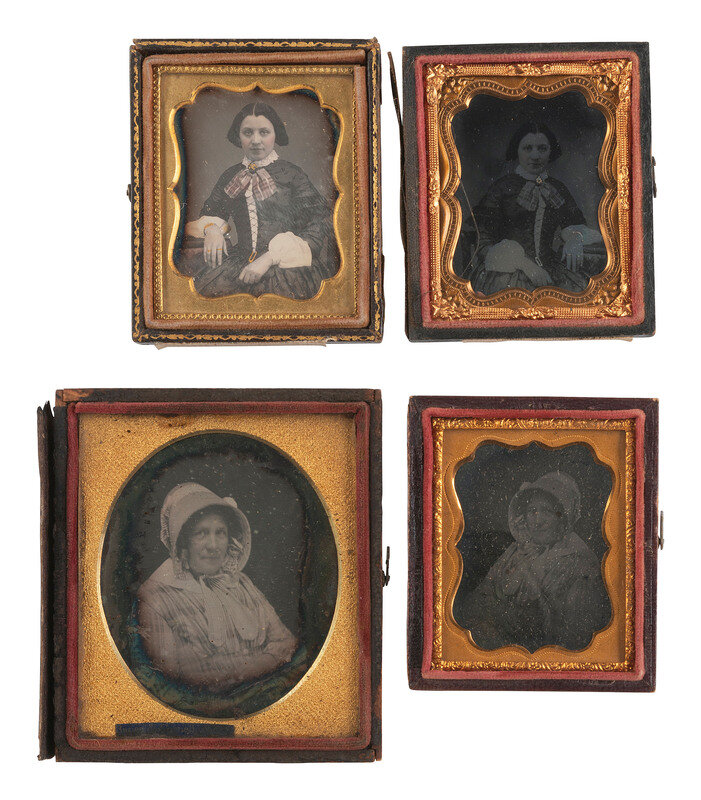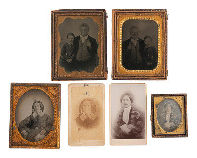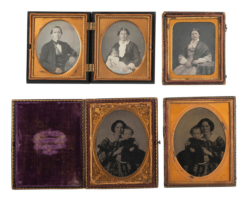 A collection of assorted pairs of images featuring the same subject, incl. example by R.E. WEEKS, Sandusky, OH. Pairs include two sixth plate daguerreotypes of the same possibly Native American woman - in one portrait (housed together in a Union case with a portrait of a man) she holds a baby, and in the other she is by herself with a closed cased image sitting on the table next to her. -- Two quarter plate ambrotypes - one likely a copy of the other - featuring a lovely young woman holding a baby in a charming, intimate pose. The original is housed under a mat stamped for "R. E. WEEKS" of Sandusky, OH, and the likely copy is housed in a case with velvet pad marked for "E. LONG" of St. Louis, MO. -- A quarter plate ambrotype and a CDV of the same middle-aged woman in the same pose - the CDV is likely a copy of the ambrotype. -- Two quarter plate tintypes of an older gentleman with somewhat unkempt hairstyle and a young boy, laterally reversed so that one is likely a copy of the other. -- And 6 more pairs of images featuring the same subjects. Conditions and housings vary. -- Together, 10 pairs of images featuring the same subject.