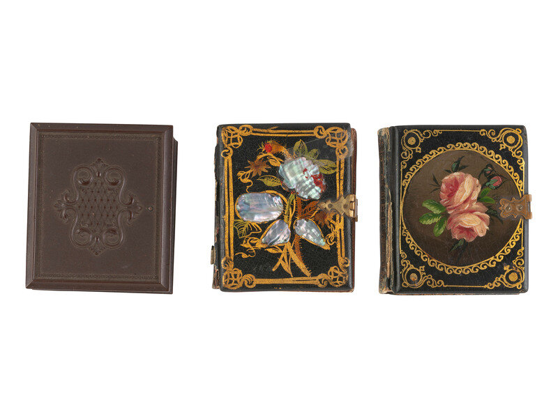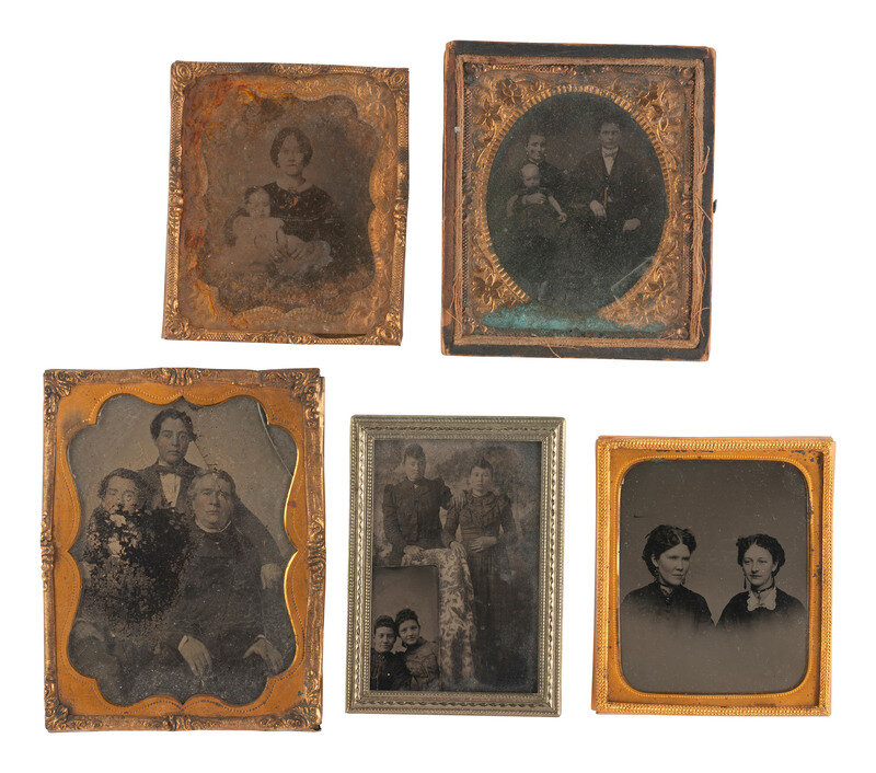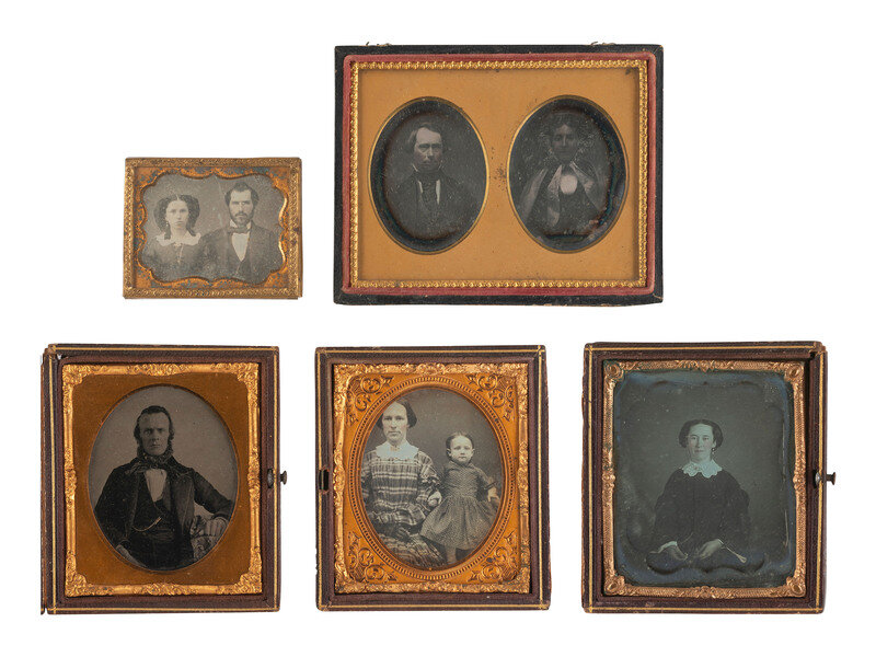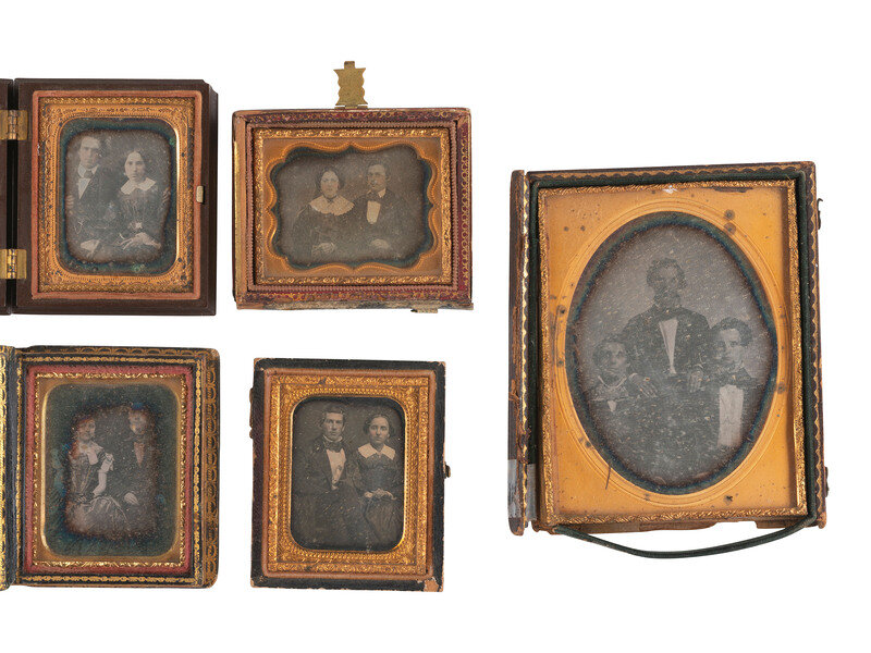 An assortment of hard images of couples and trios, incl. a pair of daguerreotypes matted together in the same case. A pair of ninth plate daguerreotype portraits featuring a man and a woman, matted together in a double oval mat and housed in a separated pressed paper case (case split at spine, with general wear throughout). (Images with tarnishing, spotting, and scratching.) -- Sixth plate daguerreotype portrait of a woman and a young girl. The woman wears a plaid dress and lace gloves, the child wears a polka dotted dress. (Minor tarnishing, some wiping to left side, other minor imperfections; unsealed.) Housed in a separated push-button case with two other images, one a daguerreotype of a woman and one a ruby ambrotype of a man (case with multiple parts fully separated, losses, wear throughout). (Images with some tarnishing, spotting, general wear.) -- A landscape-oriented ninth plate daguerreotype of a couple including a woman with a voluminous hairstyle and a man with mustache, sideburns, and goatee. (Tarnishing, spotting, small scratches and one dent, mat with oxidation; unsealed.) Housed under mat, glass, and preserver only; no case. -- And 11 other images ranging from a quarter plate daguerreotype to a gem sized tintype. Conditions and housings vary. -- Together, 17 individual images, some housed together.